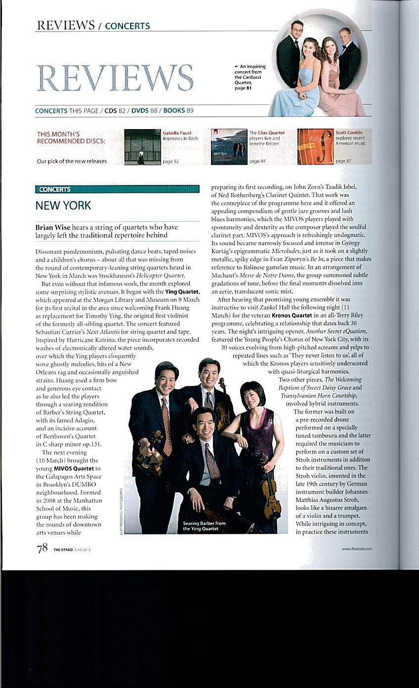 “The next evening (10 March) brought the young MIVOS quartet to the Galapagos Art Space . . . this group has been making the rounds of the downtown arts venues while preparing its first recording, on John Zorn’s Tzadik label, of Ned Rothenberg’s Clarinet Quintet. That work was the centerpiece of the programme here and it offered an appealing compendium of gentle jazz grooves and lush blues harmonies, which the MIVOS players played with spontaneity and dexterity as the composer played the soulful clarinet part.MIVOS’s approach is refreshingly undogmatic. Its sound became narrowly focused and intense in György Kurtág’s epigrammatic Microludes, just as it took on a slightly metallic, spiky edge for Evan Ziporyn’s Be In . . . In an arrangement of Machaut’s Messe de Notre Dame, the group summoned subtle gradations of tone, before the final moments dissolved into eerie, translucent sonic mist.”