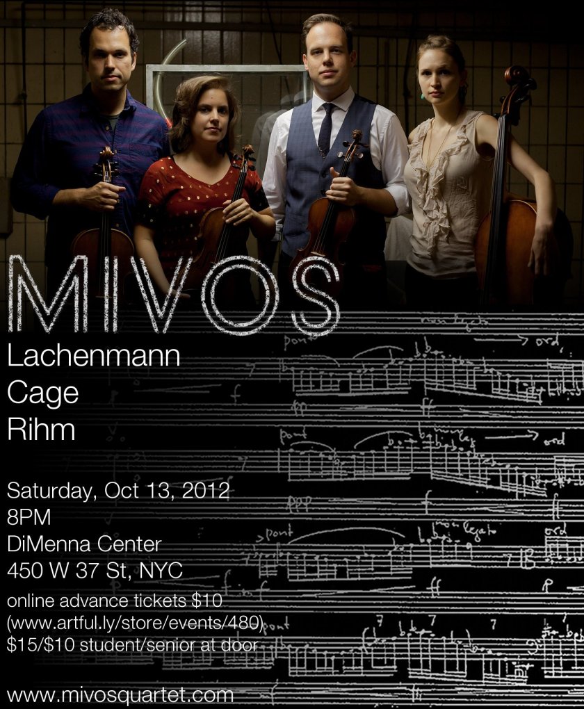 Mivos Quartet Concert Tonight, 10/13! Shows Come check it out! Wolfgang Rihm – Quartettstudie John Cage – String Quartet in Four Parts Helmut Lachenmann – String Quartet No. 3, “Grido” Related